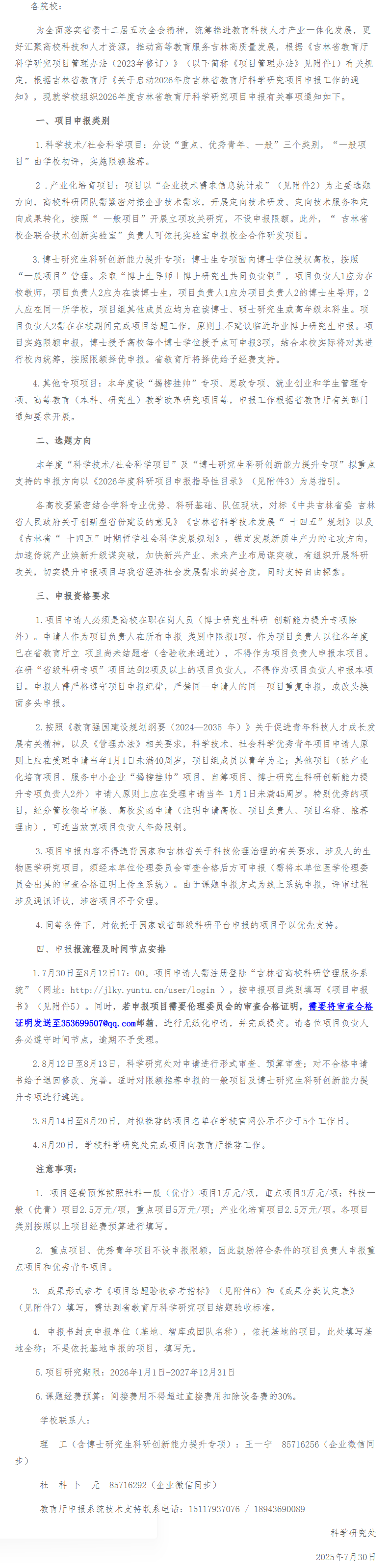 关于2026年度吉林省教育厅科学研究项目申报工作的通知