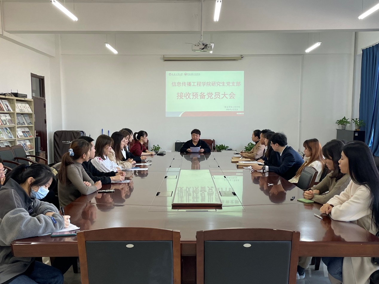 本网讯(通讯员 王阳洋)11月13 日,信息传播工程学院研究生党支部在信息楼会议室召开接收预备党员大会。此次会议由党支部书记孙月玖主持。大会主要流程为接收刘昊南、唐伟宸、石德馨3 名发展对象为中共预备党员。