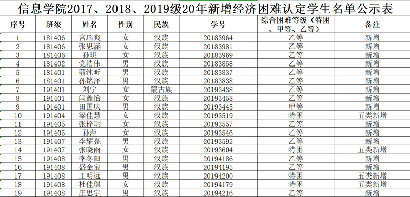 现对信息传播工程学院20年新增2017、2018、2019级经济困难认定学生名单予以公示,公示时间为2020年10月6日——10月8日。