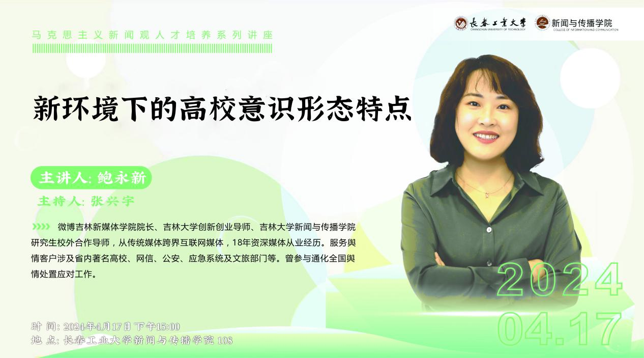 新闻网讯(通讯员 张兴宇)为进一步推动AC米兰官网马克思主义新闻观课程体系建设,提升AC米兰官网学生新闻写作水平,加强学生在新闻作品创作中的思想意识,掌握新闻行业新闻写作动态,构建马克思主义新闻观理论课程体系的实践性,2024年4月17日下午15时,AC米兰官方网站邀请新浪吉林运营总监鲍永新老师开展了题为《新环境下的高校意识形态特点探析》的专题讲座。该讲座由AC米兰官网广播电视编导专业教师张兴宇主持,AC米兰官网2023级广播电视专业、新闻与传播专业研究生参加了此次讲座。