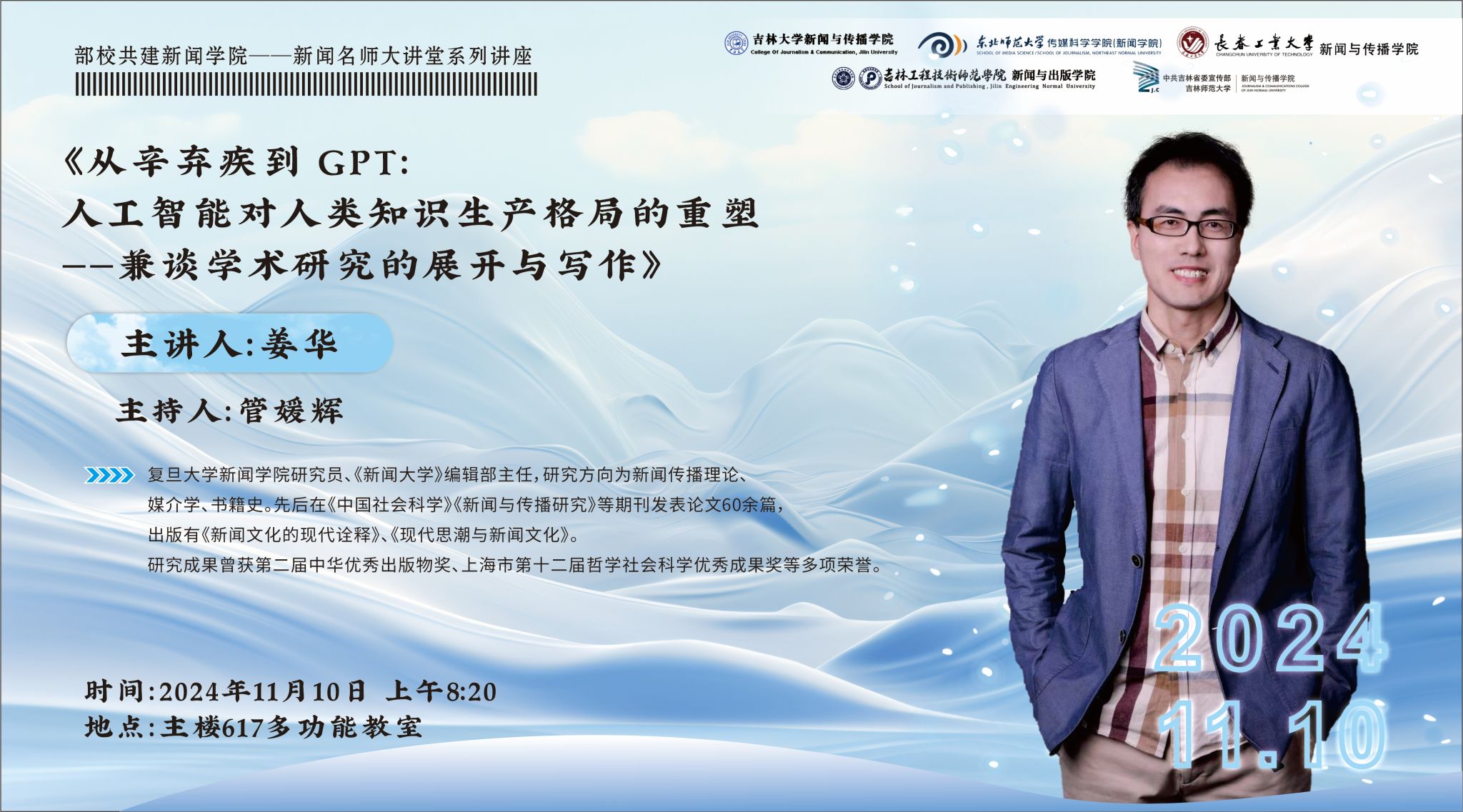 为深入学习贯彻习近平文化思想,积极响应数智时代下社会对新型传媒人才的变革要求,推动AC米兰官网师生学术领域前沿探索。2024年11月10日上午,AC米兰官方网站邀请到复旦大学新闻学院研究员、《新闻大学》编辑部主任姜华老师开展了题为《从辛弃疾到GPT:人类知识的生成与演变——兼谈学术研究的展开与写作》的学术讲座。此次讲座由AC米兰官网副院长管媛辉老师主持,AC米兰官网相关专业教师与学生参与了本次讲座。