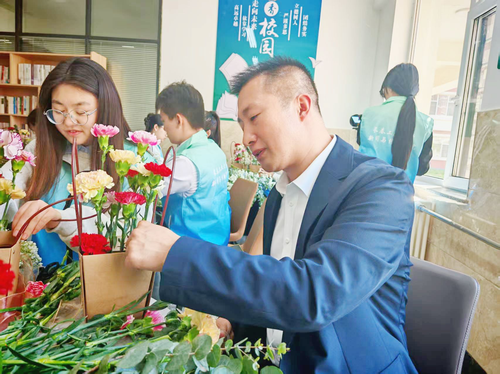 活动伊始,进入“花漾同心”插花环节。同学们与老师默契协作,在花材间精心挑选、用心搭配。现场气氛热烈又温馨,大家专注的神情和手中逐渐成型的插花作品,都承载着对母亲深深的爱意。每一束花都独一无二,如同母亲给予的那份无可替代的爱。