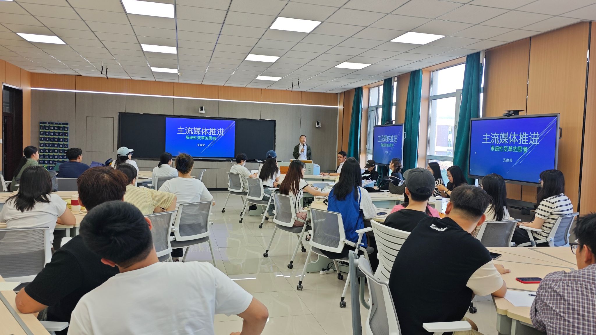 讲座伊始,支庭荣教授从国家战略的宏观高度切入,精准引用党的二十大报告与二十届三中全会决定中关于“加强全媒体传播体系建设,塑造主流舆论新格局”的核心政策精神,为讲座奠定了高远的立意。他将主流媒体的系统性变革这一宏大议题,清晰解构为“媒体融合简史”与“媒体系统性变革的战略与策略”两大部分内容,层层递进,引领师生进行了一场深刻的思想遨游。