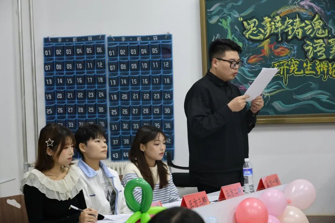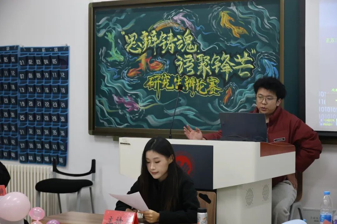 本场辩论赛主持人为陈彦青,评委团由学院研究生会执行主席宋宝堂,轮值主席刘忠豪,权益部负责人李想,生活部负责人赵书慧,202413班班长刘千赫组成。